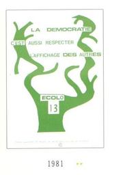 Affiche de couleur blanche avec une écriture verte. Le dessin représente un arbre vert. La référence à l'éditeur responsable a été écrite à la main.