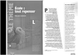 • Ce dossier comporte les articles suivants : - Des projets différents? (Jacques Liesenborghs) - "L'enfant ne doit jamais être mis en échec" (Entretien avec Jean-Pierre Coenen) - "Arrêtons le massacre d'élève" (Entretien avec Eric Van der Aa) - Construire une école où vraiment enseigner - Collectif "Epine" - "Les vieux démons colaires ne sont pas morts" (Entretien avec Françoise Guillaume, Laurence Jaumol et Annick Petiau) - Défendre le statut des enseignants (Entretien avec Valérie De Nayer) - Attention : dualisation (Jos Beni) - Mixité sociale, qu'ils disaient (Noëlle De Smet) - Maximiser le développement de chaque élève, (Noëlle De Smet) - L'école du coin (Kathleen B.) - Freinet, une vision politique de l'école (Jean Dumont) - Une recherche exemplaire (Entretien avec Yves Reuter) - Pourquoi des élèves actifs? (Bernard Rey) - Pour quoi, pour qui, comment? (Jacques Liesenborghs)