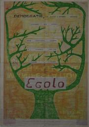 Description graphique Affiche de couleur jaune-orange et verte. Un arbre est dessiné. L'affiche a été dessinée au dos d'une affiche existante. L'écriture de la première affiche est visible au travers de l'affiche actuelle. Description textuelle La démocratie, c'est accepter la différence notamment l'affichage des autres = moins d'affiches utilisées et d'arbres abattus = économie d'énergie / Ecolo / Editeur responsable : Théo Bruyère 165 rue du Laveu 4000 Liège 041/526523