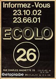 Informez-vous / 23.10.02 / 23.66.01 / ECOLO 26 / Rue Charles Magnette 25 (23.10.02) de 16 à 19h / Rue des Mineurs 25 (23.66.01) de 15 à 18h / Imprimerie L'Atelier Rue Hors Chateau, 33 Liège. TEL : 041/23 47 49 / Ed. Resp. : Théo Bruyère 165 rue du Laveu 4000 Liège